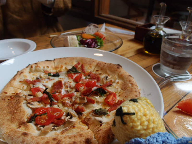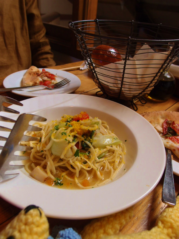 網焼き帆立とカラスミのパスタと伊産サラミとマッシュルームのピッツァ 。