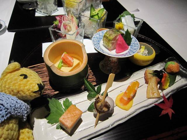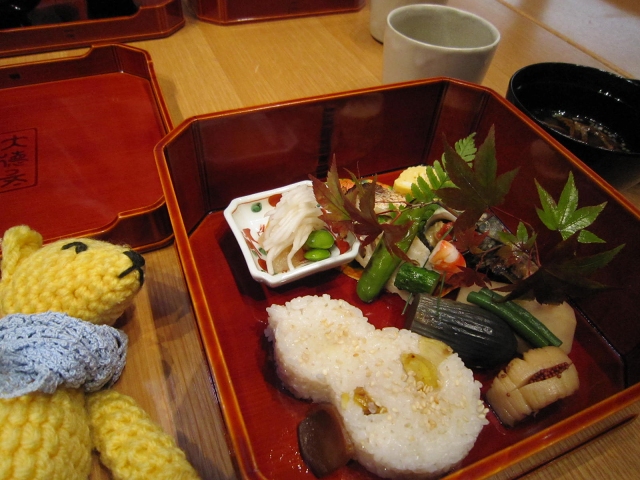 東山旧岸邸の秋の講演会の2回目は、武者小路千家千宗屋氏が亭主のお茶の会という貴重な体験。・・・の前に腹ごしらえの紅葉弁当。目にもおいしかった。お茶会はさすがにたみおショットはできず。あしからず。