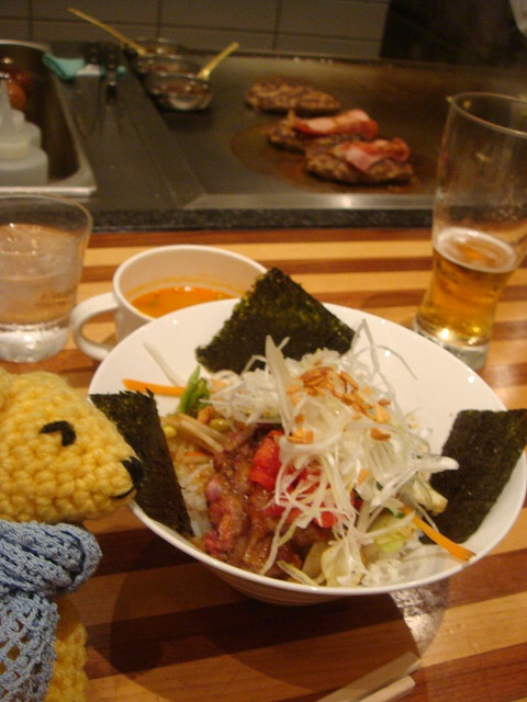 もうなんかね、肉とビールしかないっしょ、ってことで鉄板焼きランチ決定。牛ロースステーキ丼は野菜もたっぷりでおいしかったし、トマト味のブイヤベース風味の味噌スープも意外な味わいで美味。
