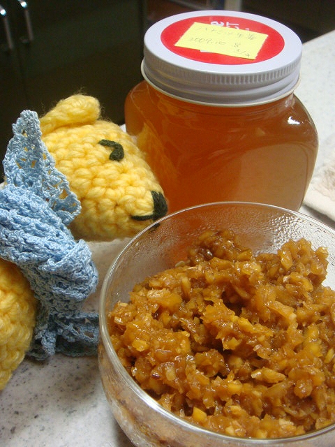 味噌漬けふりかけホロホロ生姜。最近白いご飯にはこれがかかせない。あまりにも気に入ったのでジンジャーティー用に蜂蜜漬けにしておいた生姜を真似して加工してみた。天才的大成功。いぇい。