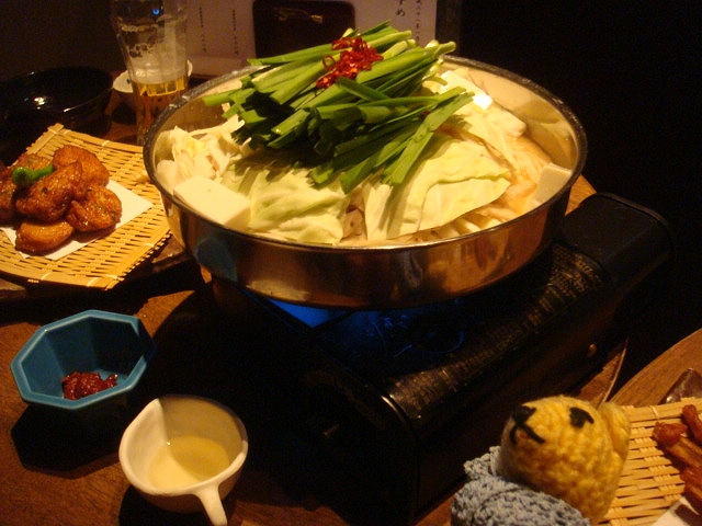 キャベツ、ニラ、ゴボウがたっぷり入った味噌仕立ての赤モツ鍋で新年会。