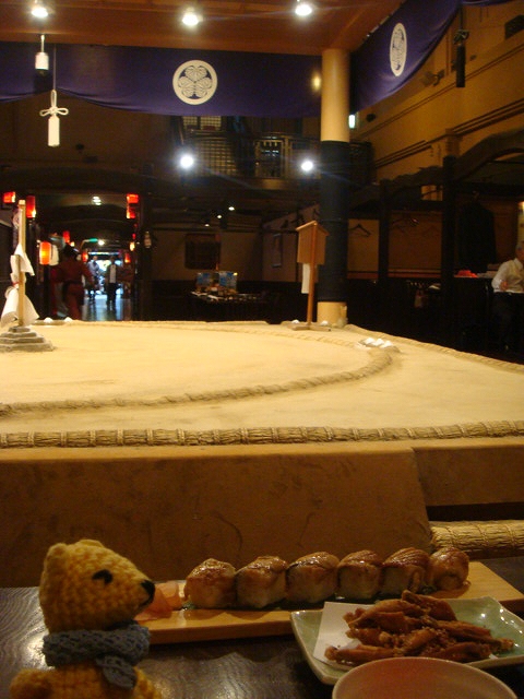 両国駅前の居酒屋に入ったらでーんと土俵が!図らずも土俵下の枡席で相撲甚句も観覧。