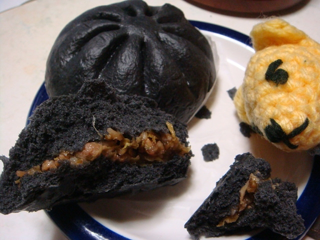 箱根大涌谷みやげ、極楽茶屋の黒もんじゃまん。黒っ。