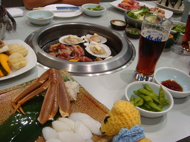 プレミアムビール琥珀の時間なぞ飲みながら焼き焼き。網で汁をこぼさぬように完璧に焼きあげたホタテが、皿に置く瞬間にみごとにひっくり返ったのはもはやいい思い出、か。。。
